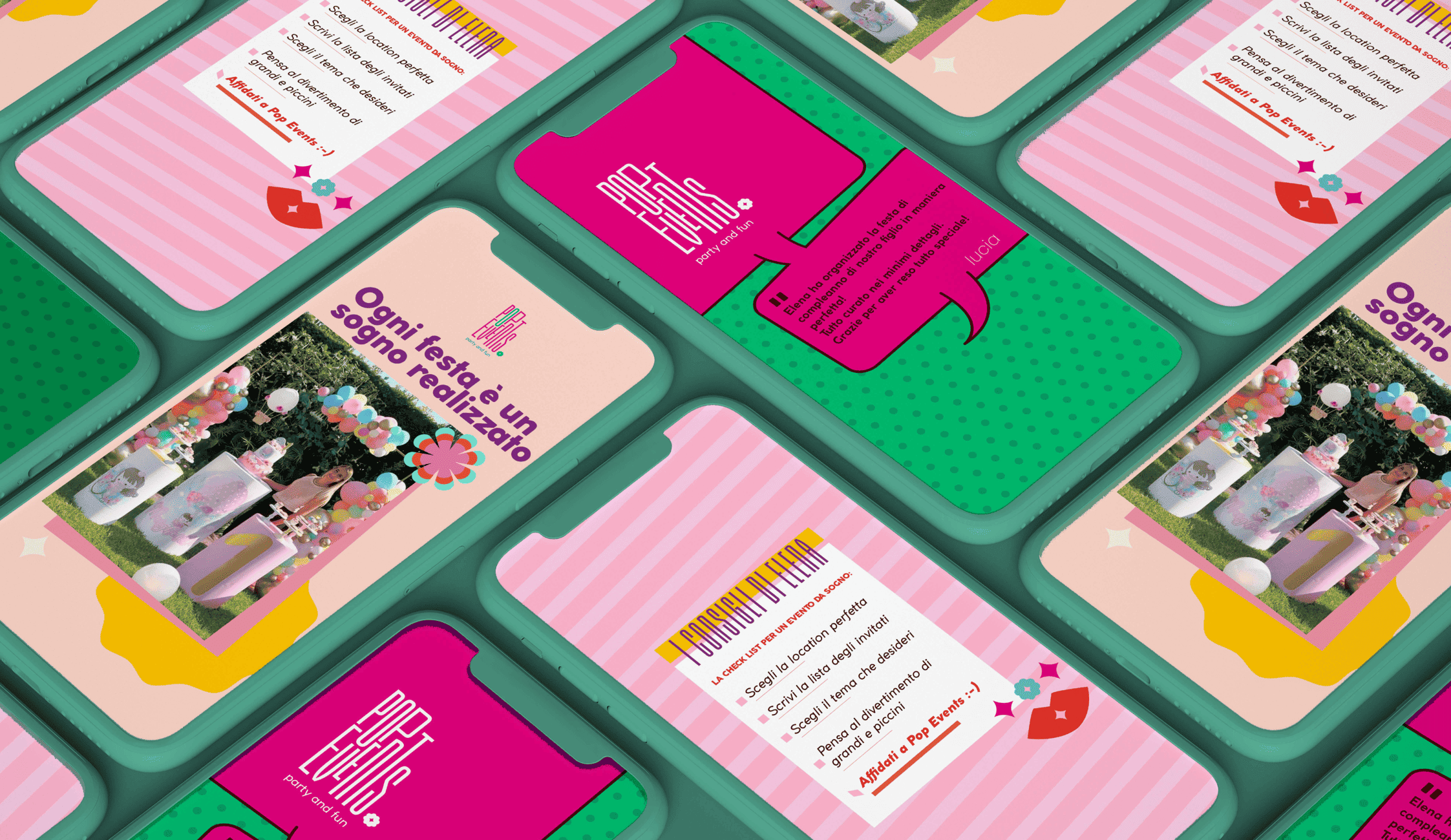 Dopo un lungo brief con la Founder, Elena Gaito, ci siamo immerse completamente nel suo progetto e abbiamo immaginato insieme a lei il mondo dei sogni di Pop Events. Un mondo fatto di “colori, giochi e fantasia”. Sono queste le parole che ci hanno ispirato nella progettazione del marchio e della brand identity che ha preso vita online e offline.